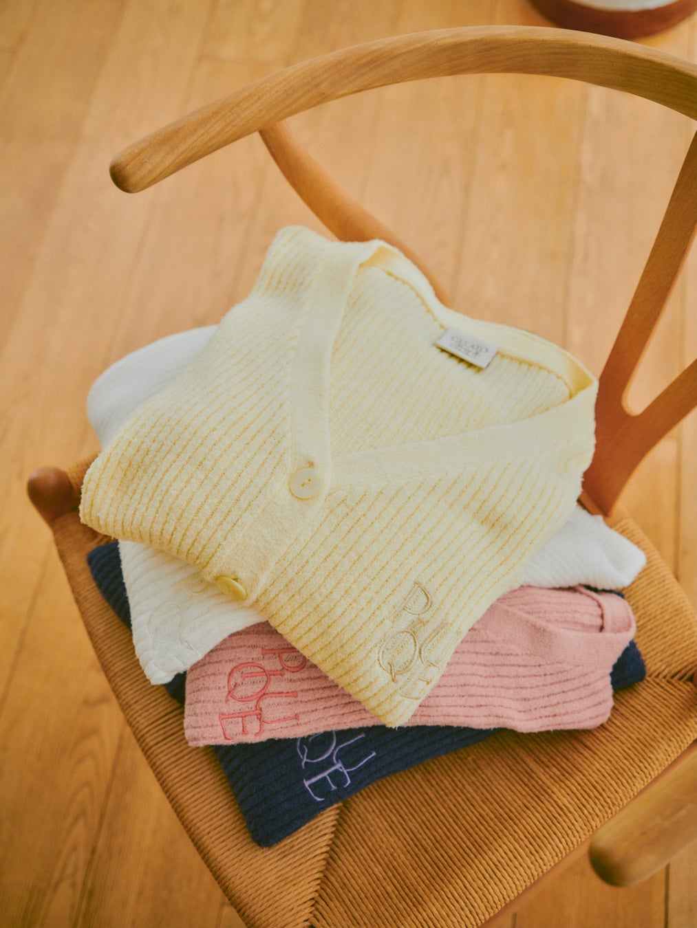 とろけるように柔らかなタッチに癒されるリブカーディガン。短めの丈感とゆったりした袖ぐりなので、ワンピースなどの羽織りにぴったりです。胸元にはワンポイントでロゴ刺繍を入れました。色はオフホワイト、イエロー、コーラル、ネイビーの4色展開。同コレクションの花柄シリーズに合わせたカラーリングになっているので、組み合わせて大切な方へのギフトにおすすめです。