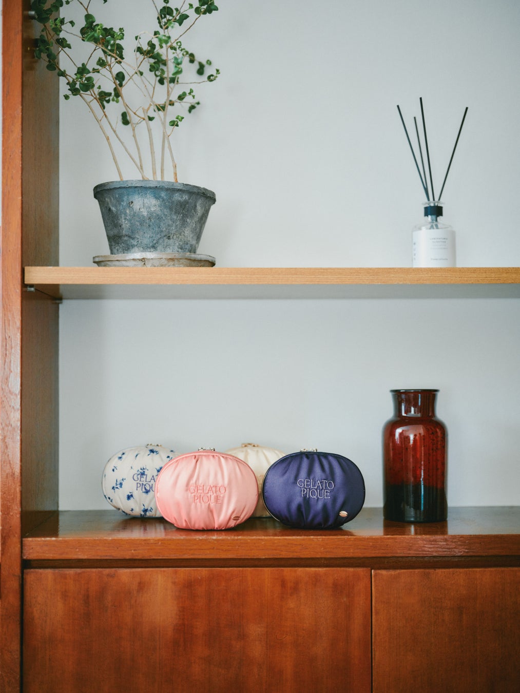 ギャザーを寄せたサテン素材を使用した、華やかなムードのポーチ。手にしっくりなじむふっくらとしたオーバル型は、普段使いのメイクポーチにちょうど良いサイズ感です。