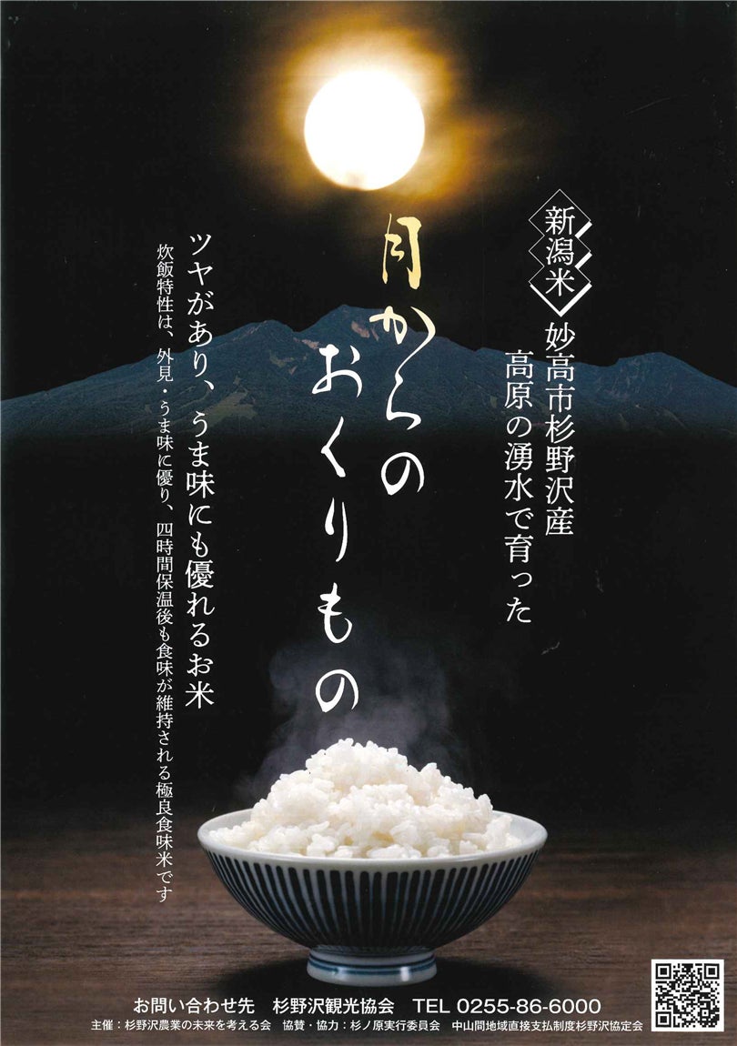 キノコ汁の振る舞い(数量限定)、杉野沢産ブランド米「月からのおくりもの」の販売を実施いたします。