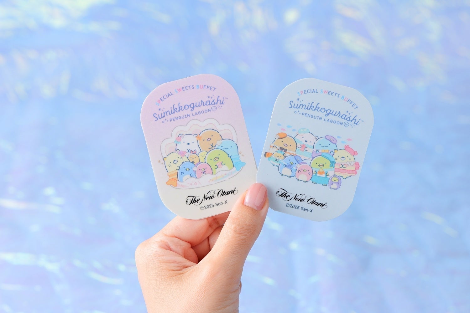 『すみっコぐらしスペシャルスイーツビュッフェ~ぺんぎんラグーン~』にご来場のお客さまには、1名さまにつきオリジナルステッカーを1枚プレゼント。デザインは2種類ご用意しています(デザインは選べません)。夏休み限定スイーツビュッフェの思い出に、スマホに忍ばせても可愛いデザインです。