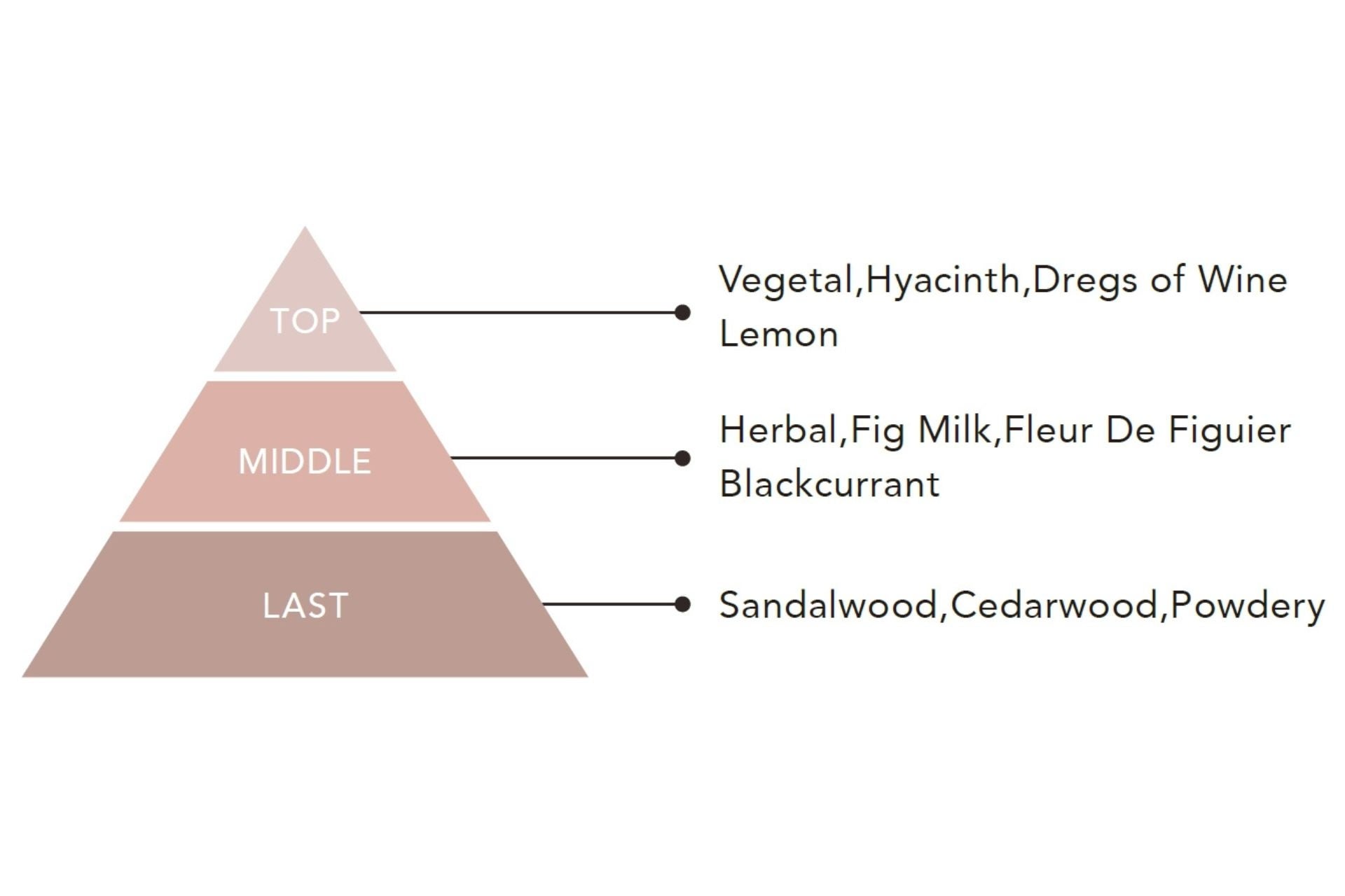 最初に広がるのは、成熟したフィグの果実のように甘くやわらかな香り。それが次第に湿った土を思わせるアーシーなミドルノートへ移りゆき、ラストはセージやサンダルウッドの心安らぐ調べに。冷たくもどこか優しい、爽やかなそよ風をイメージしたアコードは、自分だけの庭でくつろいでいるときのようにリラクシーな幸福感をもたらします。