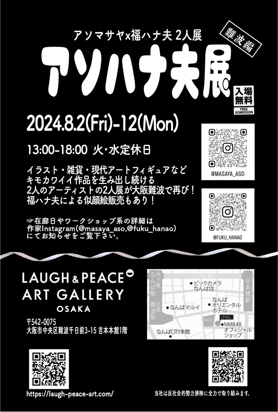 2024年8月2日(金)~12日(月・祝)の期間、大阪・ LAUGH & PEACE ART GALLERY OSAKAにて、アソマサヤ×福ハナ夫による2人展、「アソハナ夫展 難波編」を開催いたします。