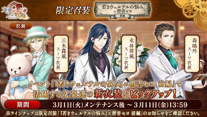 さらに、イベントと同時に開催される限定召装『「若きウェルテルの悩み」ニ潜書セヨ 前編』にて新規追加された「三木露風」「永井荷風」「森鴎外」の〈スーツ衣装〉を編成すると、得点の獲得率がそれぞれ30%上昇します。