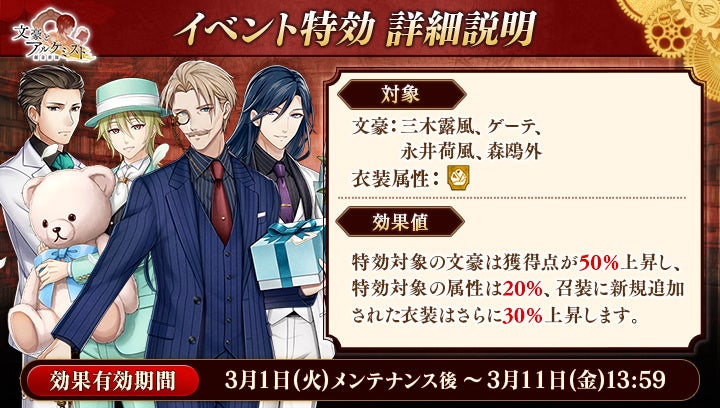 期間中「三木露風」「ゲーテ」「永井荷風」「森鴎外」の衣装を編成して潜書すると、得点の獲得数がそれぞれ50%上昇します。また、「土」属性の衣装を編成して潜書すると、得点の獲得数がそれぞれ20%上昇します。