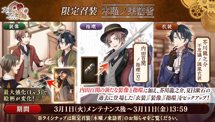 文豪の「衣装」や、会派に装備する事で能力を強化できる「装像」などが入手できるコンテンツ「召装」に、限定召装「木曜ノ来訪者」が期間限定で登場します。この召装では新しく追加された内田百閒の装像と指環が一定の確率で入手可能な他、過去に登場した芥川龍之介、夏目漱石の衣装、装像、指環などを入手できます。