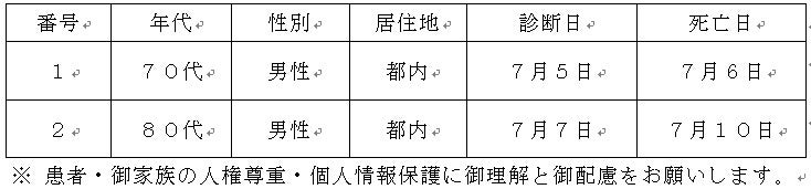 都内で新型コロナウイルスに感染した方が死亡されましたのでお知らせします。お亡くなりになった方のご冥福をお祈り申し上げます。