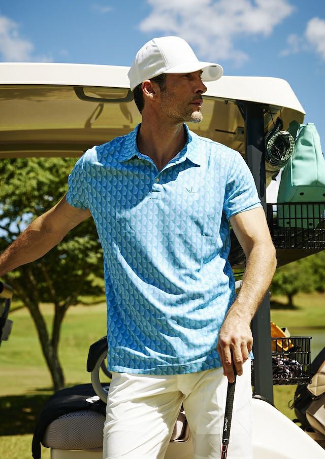 ブランドを象徴するアイコン“鶴”を、モダンな幾何学パターンとして全体にあしらったポロシャツ。鮮やかなカラーリングがグリーン上での存在感を際立たせ、スタイリッシュな印象を演出します。胸元には控えめながらも品格漂う刺繍ロゴを配し、さりげないラグジュアリーを表現。格式あるゴルフ場のドレスコードにも対応しつつ〈ウノピュウノウグァ―レトレ〉らしい遊び心と洗練が共存する一着です。 素材にはポリエステル100%を採用。軽量で速乾性・ストレッチ性に優れ、スイング時の動きを妨げることなく、自由なパフォーマンスをサポートします。長時間のプレーでも快適な着用感をキープし、シワになりにくいため、美しいシルエットを保ちながら一日中スマートに過ごせます。