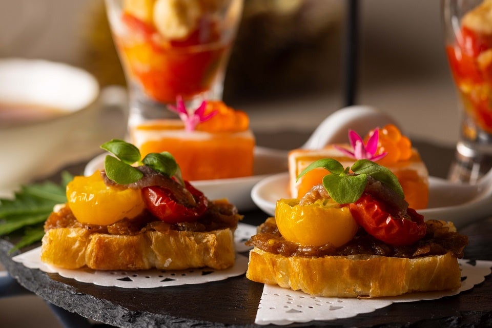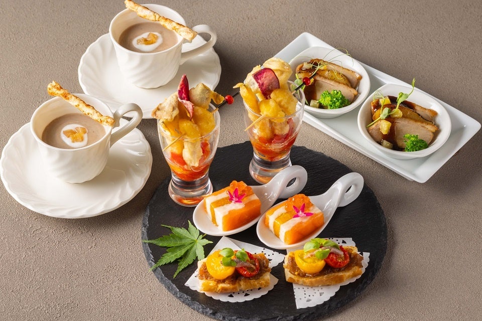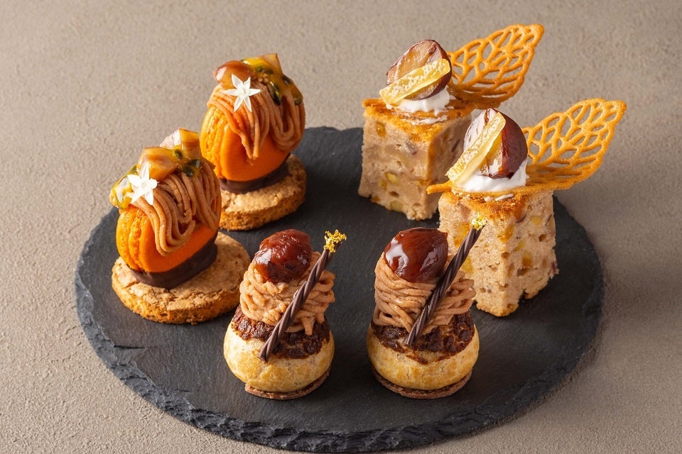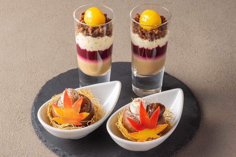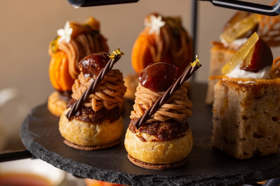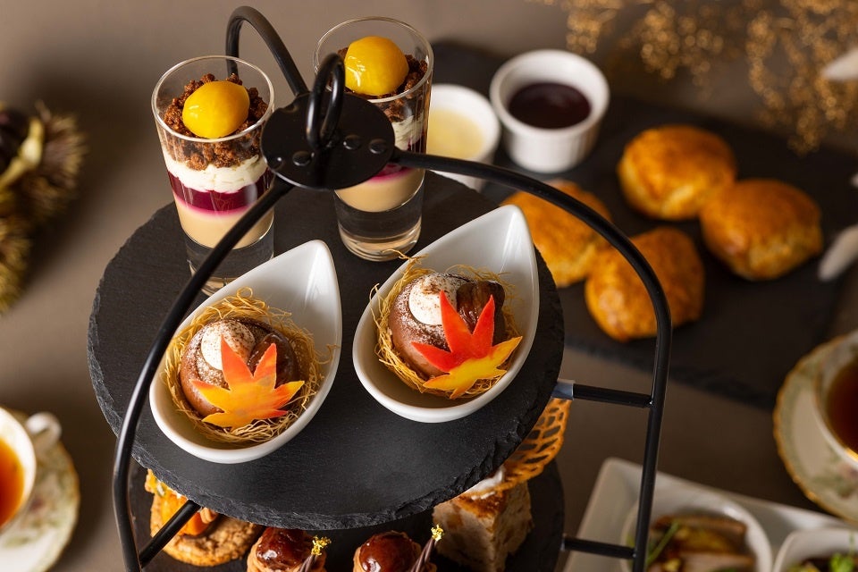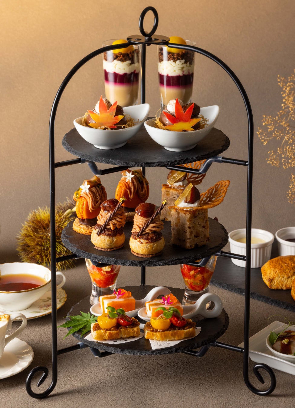 今年の秋は、栗の自然な甘さを活かした“栗”が主役のアフタヌーンティーが登場します。上段には、生クリームを使用せず、栗とバターとゼラチンで濃厚に仕上げた「マロンムース」、食べ進めるごとに食感と味わいの変化がお楽しみいただけるよう、カフェクリーム、カシスゼリー、マロンクリームを重ね、サクサク食感のコーヒー味のクランブルとマロンをトッピングした「マロンとカシスとカフェのベリーヌ」をご用意。その他にも、モンブランクリームたっぷりの「モンブランシュークリーム」や、爽やかなオレンジの風味と優しい栗の甘さが相性抜群の「マロンとオレンジのケーキ」など、様々な味わいの栗スイーツが並びます。さらに、栗を贅沢に使用した「栗のポタージュ シナモンのパイを添えて」や、セミドライされた柿をサンドした「スモークサーモンと柿のミルフィーユ仕立て」、きのこや南瓜を揚げた「秋野菜のフリットをトマトヴィネグレットソースで」など、セイボリーも秋の装いです。