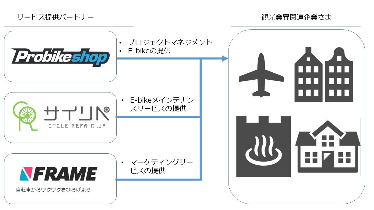 今まで、観光業界のみなさまと提携してE-bikeを提供するプランはありましたが、いくつかの観光業界関連企業さまからのご要望もあり、本サービスでは、E-bike提供に加え、充実したメインテナンス、マーケティングサービスを提供することで、観光業界関連企業さまや観光客のみなさまを強力にサポートしていきます。
