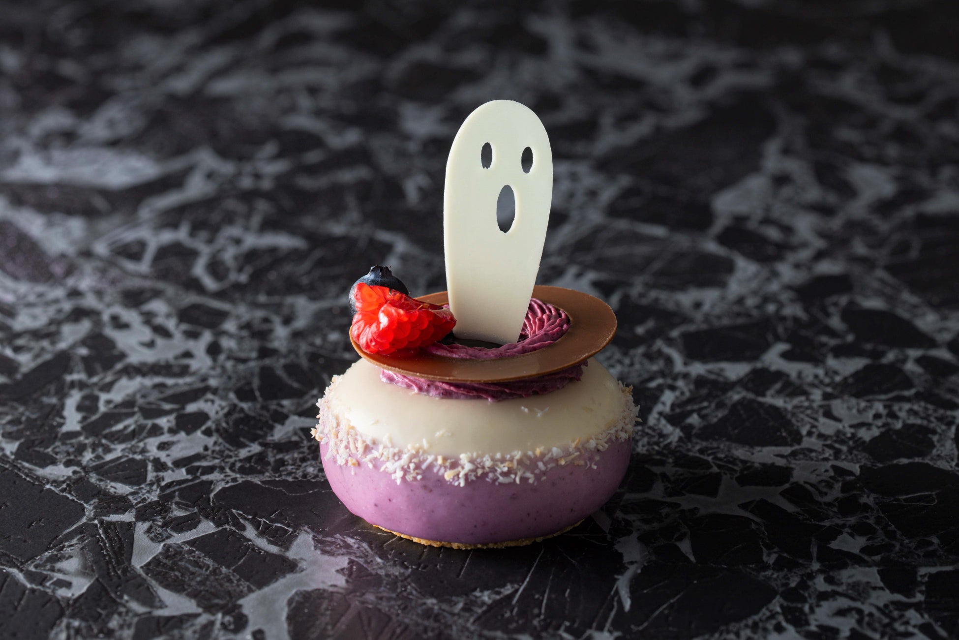 おばけが飛び出る遊び心満載のケーキは、魔女の釜をイメージした想像力を掻き立てるキュートな仕上がりに。シュトロイゼルクッキーの上に重ねたホワイトチョコレートとバニラムースの甘みとグリオットチェリーやカシスクリームの甘酸っぱさのマリアージュがお楽しみいただけます。周りにあしらったココナッツ、飾りのチョコレートが食感にアクセントを添えます。