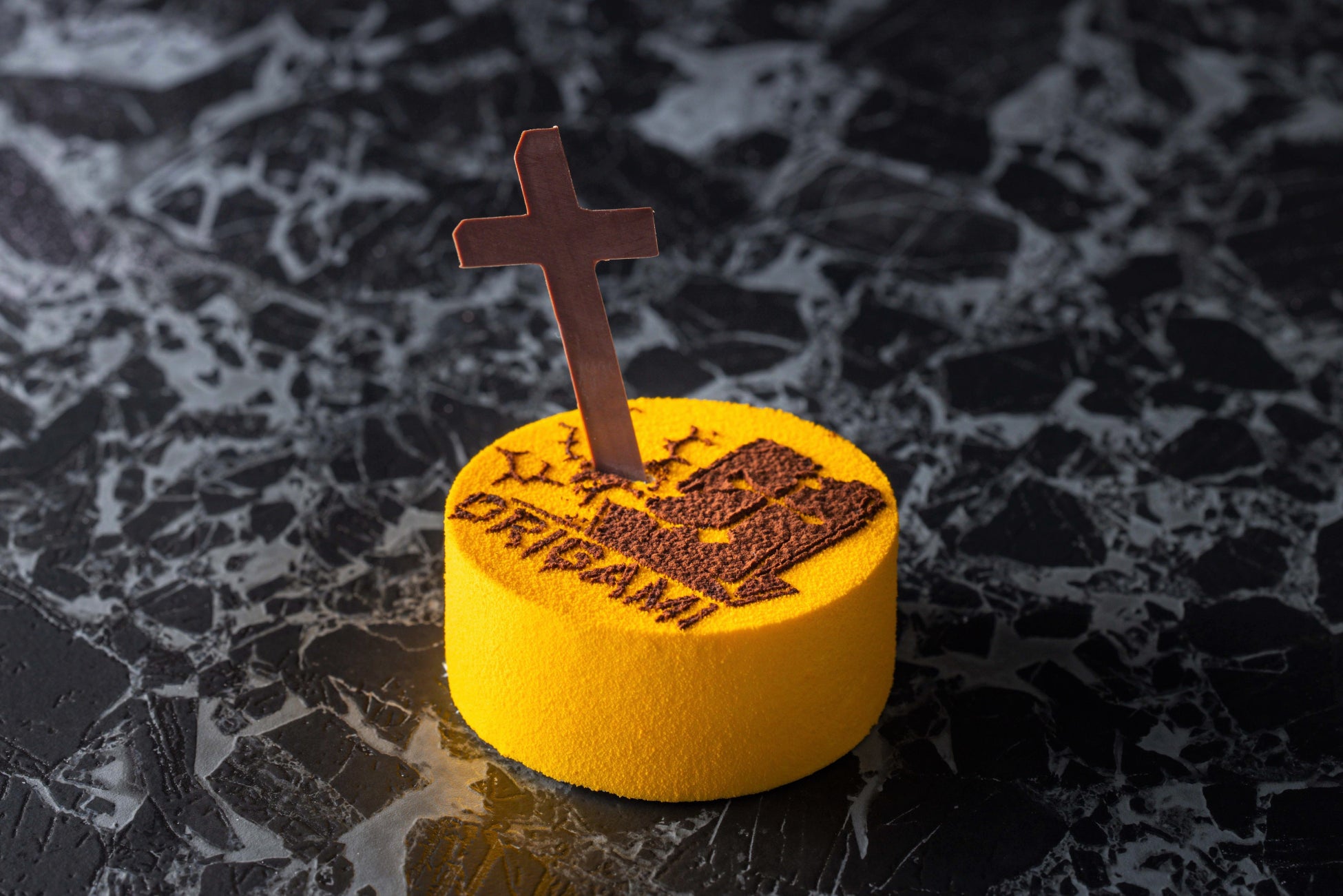 十字架のチョコレートが印象的なケーキは西洋の墓地をイメージ。かぼちゃのピュレを練り込んだムースケーキに、シナモン風味のクレームブリュレとコーヒー風味のガナッシュを忍ばせました。 コーヒーのほのかな苦味が、かぼちゃ本来の上品な甘みをより一層引き立てます。