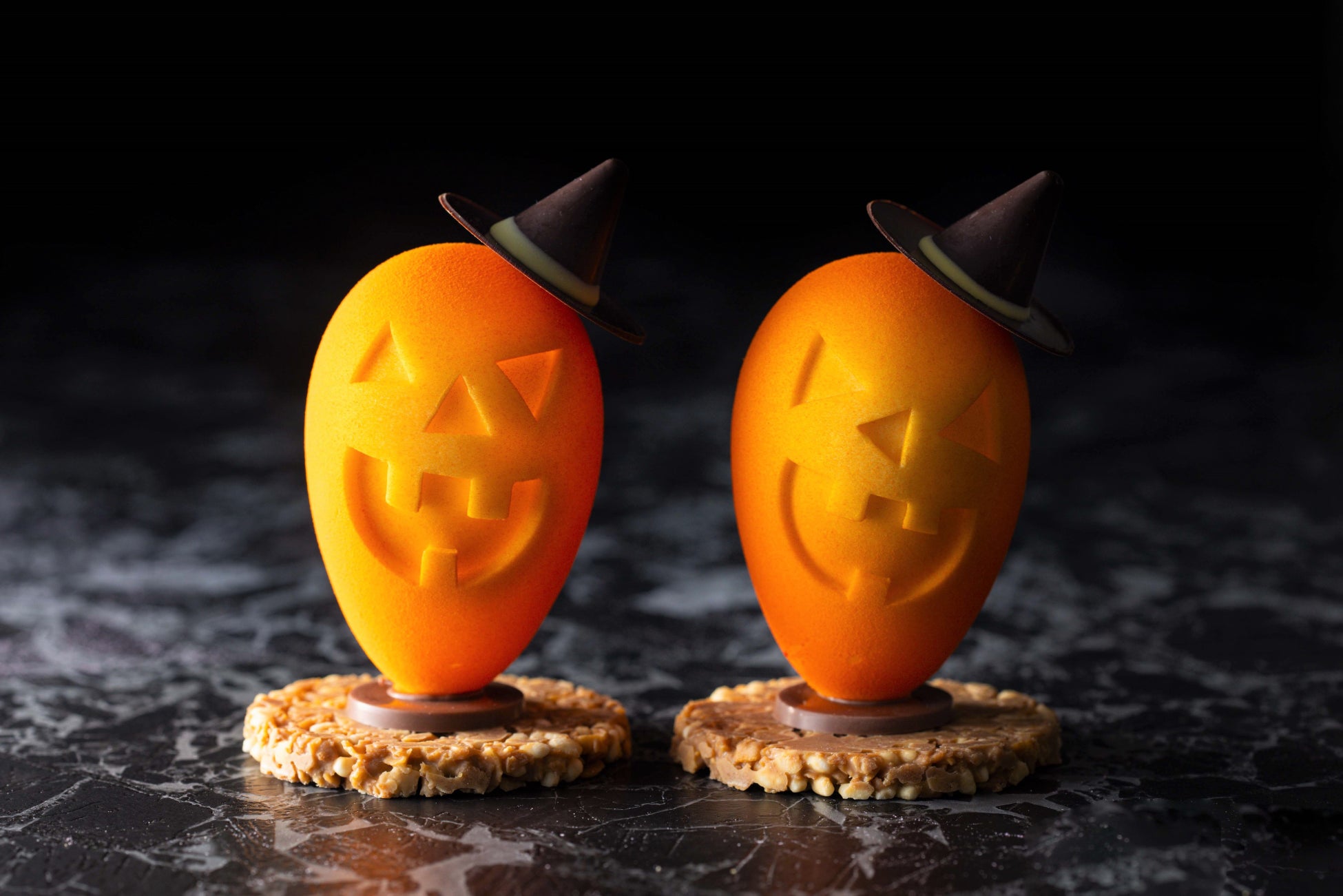 ホワイトチョコレートで型取ったジャック・オー・ランタンの中には、アーモンドとマカダミアナッツをキャラメルとチョコレートの二層で コーティングした二種類のアマンドショコラが隠されています。チョコレートでできた帽子から、土台となるザクザク食感のクランチクッキーまで余すことなく味わっていただけるスイーツです。