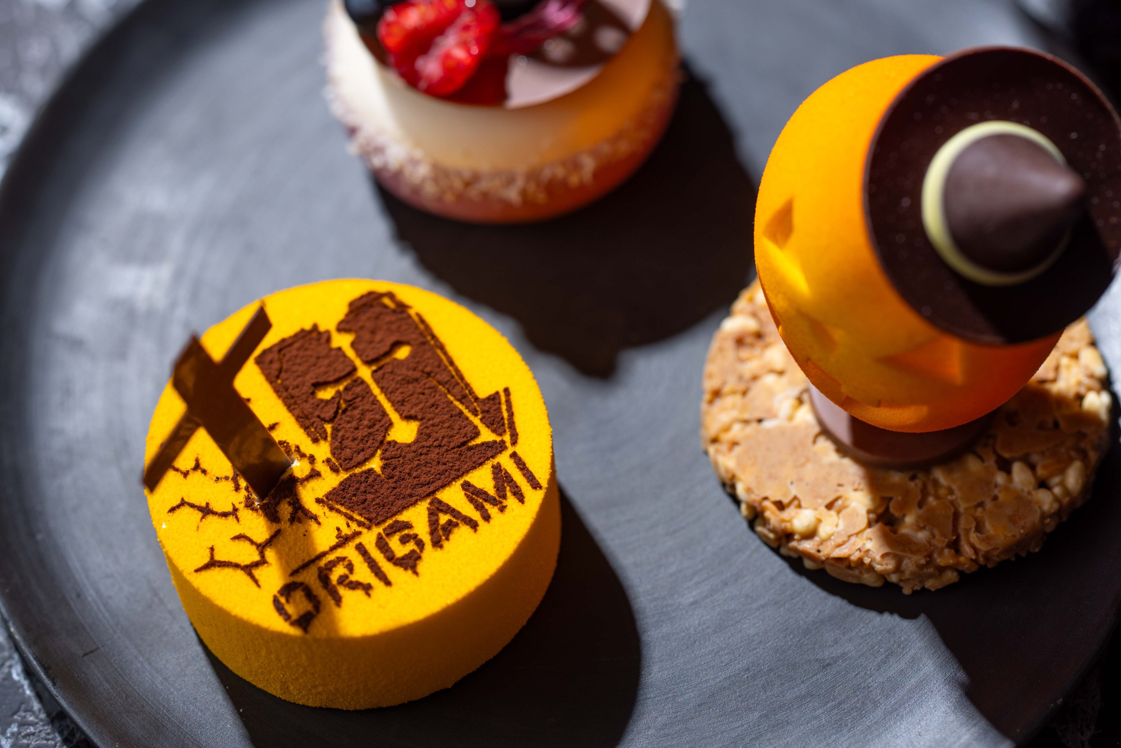 ドキリとするほどリアルなビジュアルのシェフの遊び心満載のムースケーキ。ほのかな塩味がアクセントのブロンドチョコレートの器の中は、洋梨のゼリー、ブロンドチョコレートのムースやガナッシュが層に。苺とフランボワーズのジュレを重ねることでなめらかな口あたりと瑞々しい味わいに仕上げました。