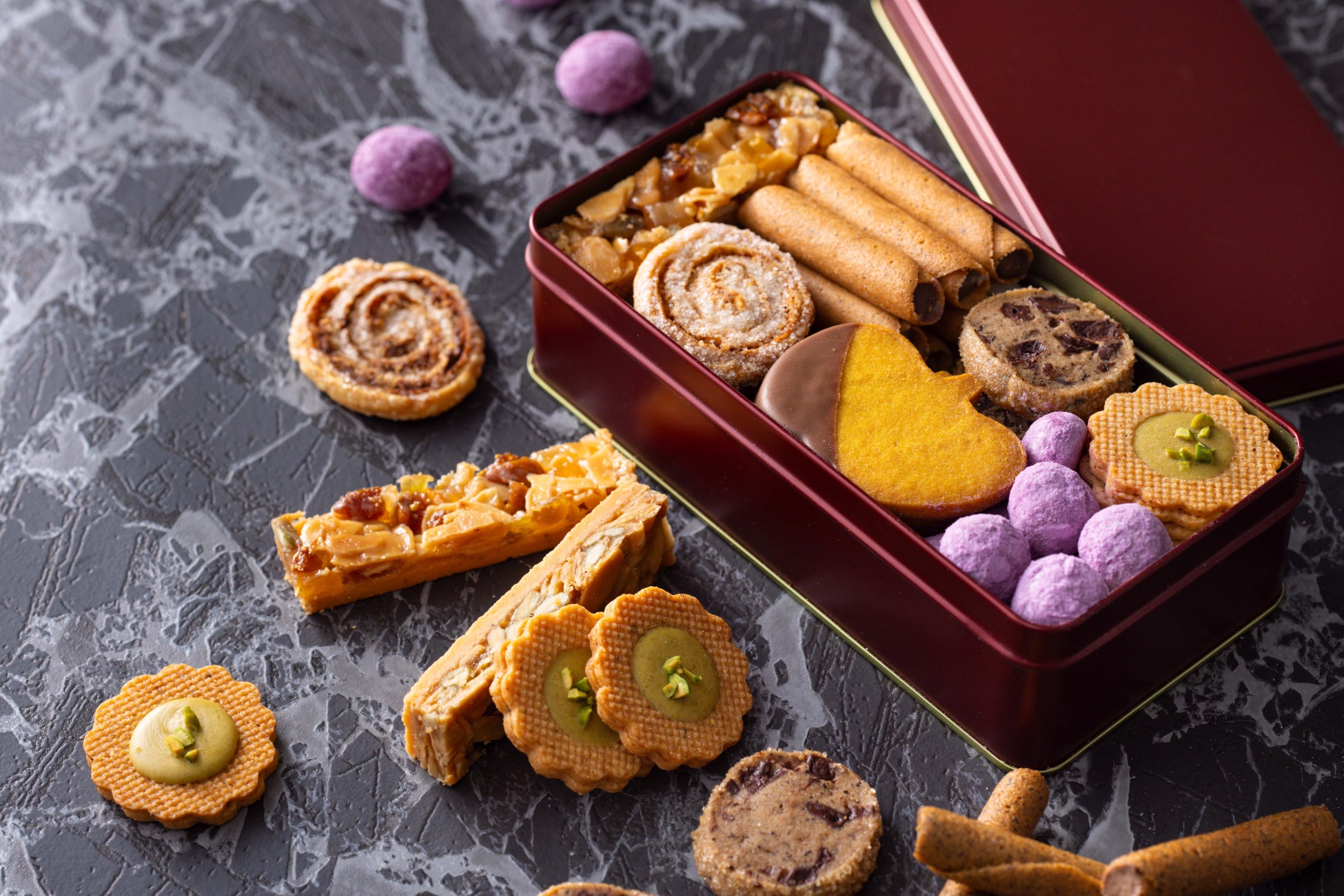 ハロウィン限定ケーキは、この季節ならではの趣向でドキリとさせたいというシェフのイマジネーションを形にした表現力あふれるデザインが満載。インパクトのあるデザインが目を引く「モンブレイン」をはじめ、リアルな青い瞳が際立つ「イービルアイ」、おばけが顔を覗かせる魔女の釜をイメージした「ウィッチポット」といった個性豊かなラインアップです。売り切れ必至のクッキー缶は、味わいも見た目も実りの秋を感じる7種のクッキーを詰め合わせました。大人も魅せられる粋な装いは季節の手土産にも最適です。