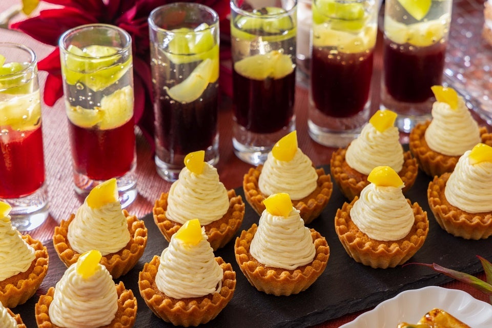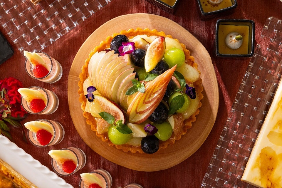 実りの秋にふさわしい季節のフルーツを贅沢に使用した期間限定のスイーツブッフェ。ブドウの女王とも言われるシャインマスカットをたっぷり楽しめる「シャインマスカットショート」をはじめ、チーズとマロンクリームを組み合わせた「フロマージュマロン」、素材の甘さを活かし口当たり滑らかに仕上げた「カボチャプリン」など、実りの秋のオールスターが勢揃いします。中でも注目は、シャインマスカットや巨峰、りんご、洋ナシなどを用いた、ひと口で秋の味覚が堪能できる「秋のフルーツタルト」です。クリームには、カスタードクリームに生クリームを合わせた甘さ控えめのレジェールクリームを使用し、フルーツそれぞれの美味しさが引き立つよう仕上げました。