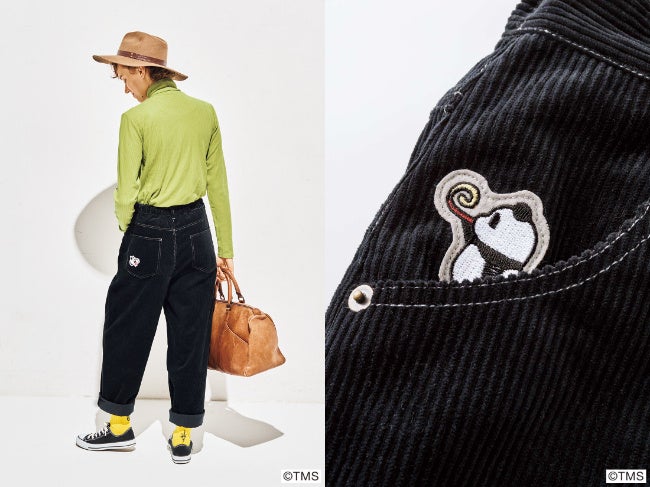 パンダ感が演出されたブラックのコーデュロイパンツです。よく見ると楽器を構えた小さなパンちゃんがヒップポケット、右ポケット、そしてボタンにも隠れています。パンダのコロンとした体形を意識しているようなカーヴィーなシルエットや、後ろゴムのウエストは、らくにはけて脚のラインなど体形カバーにもお役立ちです。