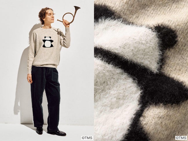 作中で何回か見られる、パパンダの大きなボディーにパンちゃんがぎゅ~っと抱きついてくるシーンを再現したニットです。ベージュ杢(もく)のボディーのフロント部分に、ふわふわのパンちゃんが編み込まれています。パンちゃんの部分は少し毛足が長くなっているのもポイントです。着るだけで、パパンダになったようなしあわせな気分が味わえる、心もからだもあたたかくなれるニットです。