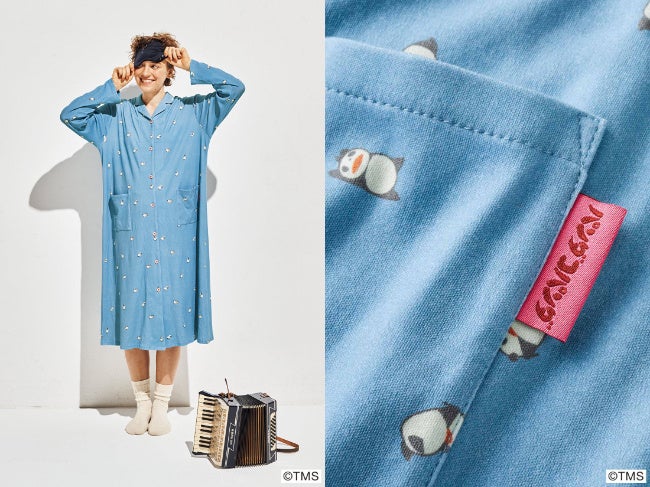 「パンダコパンダ」のオープニングアニメーションにある、パンちゃんがでんぐり返しをしたり、助走をつけてジャンプして、ずっこけたりするキュートなシーンが描かれたパジャマワンピースです。パンちゃんのかわいいフォルムが、軽くて伸びやかなコットンフライス生地に水玉模様のようにプリントされています。ピンクのボタンに描かれた「パ」の文字や左ポケットわきのピスネームなど、細部まで遊び心の感じられるデザインで、大人が着られるファンシーさも魅力です。