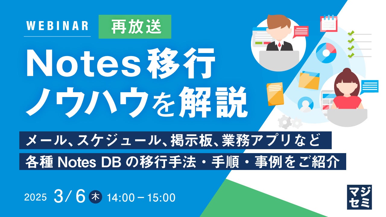 マジセミ株式会社は、大変好評をいただいた「Notes移行ノウハウを解説」というテーマのウェビナーを再放送します。