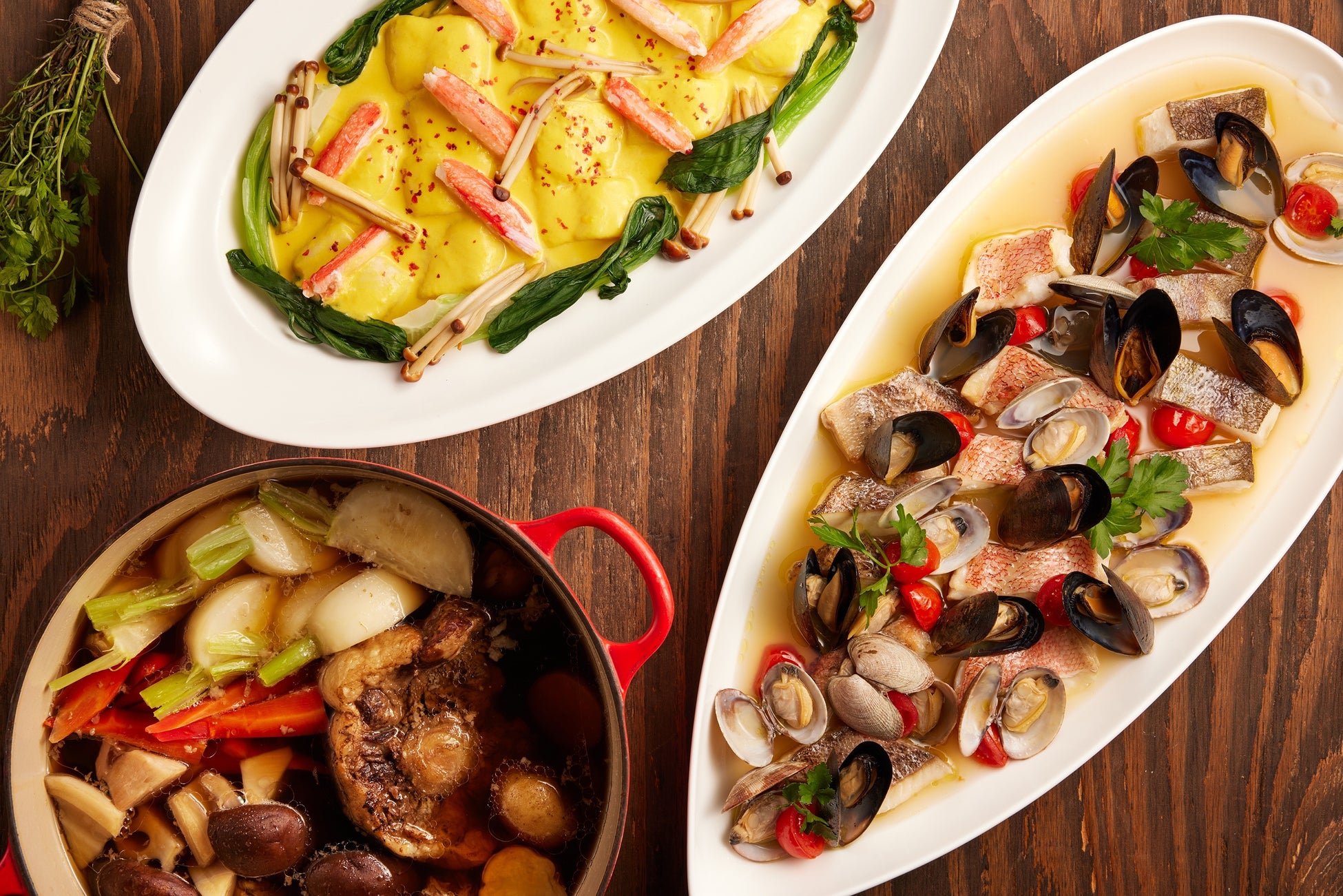 スペシャルコーナーで提供する「トゲズワイ蟹のヴァプール 5種のソース」は、トゲズワイ蟹をふっくらと蒸し上げた、蟹本来の甘みをご堪能いただける一品です。アボカドオイルや蟹酢など、5種類のコンディメントと合わせてお召し上がりください。「蟹をのせた雲丹とゆり根のフラン じゃがいものスープ」は、百合根入り雲丹の洋風茶わん蒸しと滑らかなじゃがいものスープに蟹をのせた、どこかほっとする温かみのあるお料理です。雲丹と蟹の贅沢なハーモニーをお楽しみいただけます。また、冬の食材をふんだんに使用して仕立てられた「蟹と白身魚ときのこの白ワイン蒸し サフランクリームソース」や、針生姜と白だしであっさりと炊き上げた「蟹ときのこのご飯」など、蟹を贅沢に使用したお料理を豊富に取り揃えました。