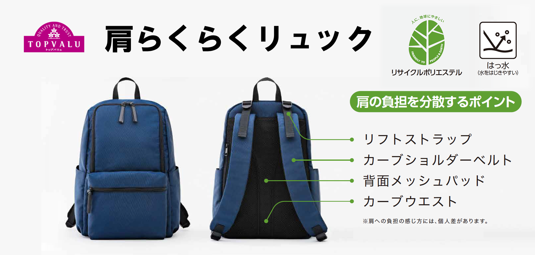 リサイクルポリエステル100%で環境にもからだにもやさしい◎肩の負担を分散する「トップバリュ 肩らくらくリュック」店舗とWEBで新発売
