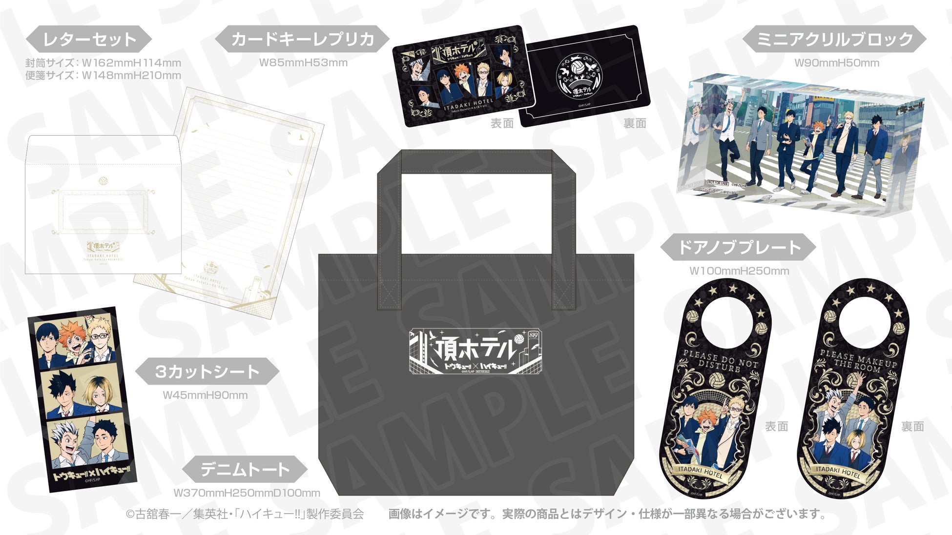 デニムトートバッグ / ミニアクリルブロック / カードキーレプリカ / ドアノブプレート / レターセット / 3カットシート