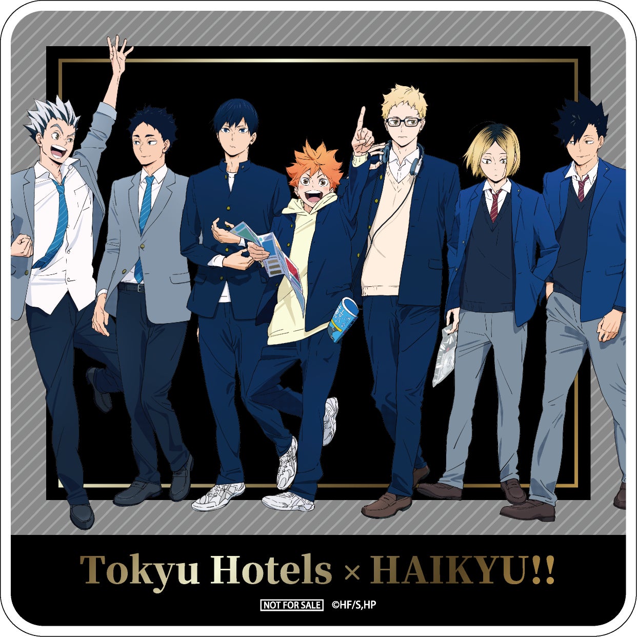 「【ハイキュー!!】頂ホテル コンセプトルーム宿泊プラン」あるいは「【ハイキュー!!】頂ホテル 通常客室プラン」にご宿泊いただいたお客様はフロントにて、描き下ろしビジュアルを使用した「オリジナルカードキーレプリカ(7枚セット)」をお買い求めいただけます。ご宿泊特典のカードキーレプリカはキャラクターが7名集合したデザインですが、こちらの商品は各キャラクターのデザインが1枚ずつ入った7枚セットで販売しております。