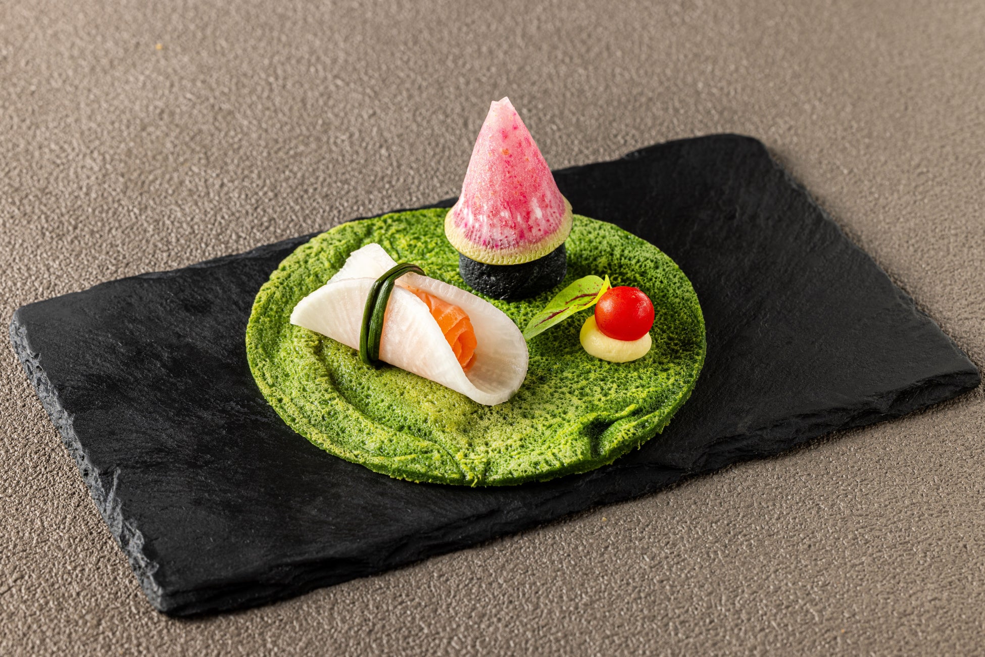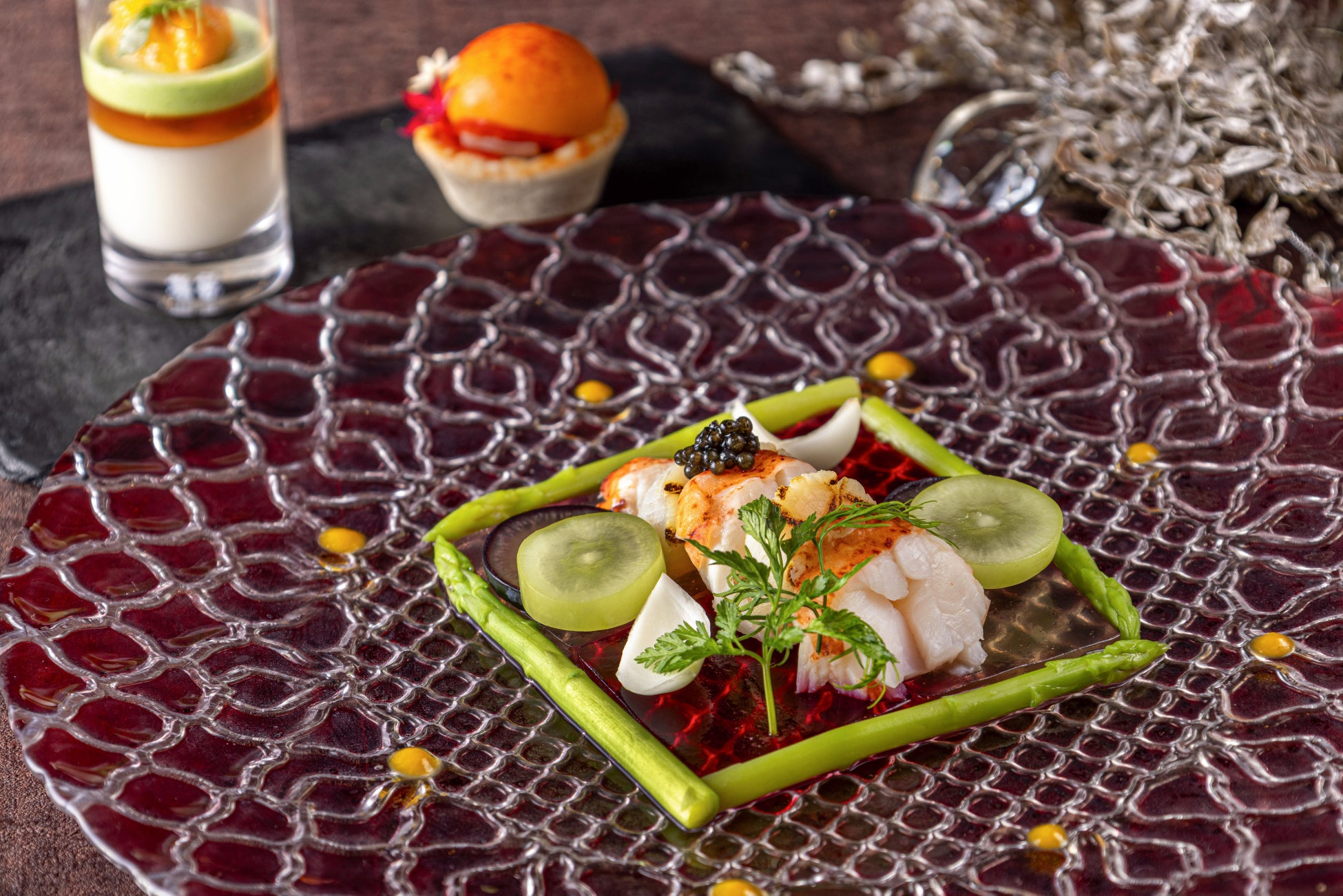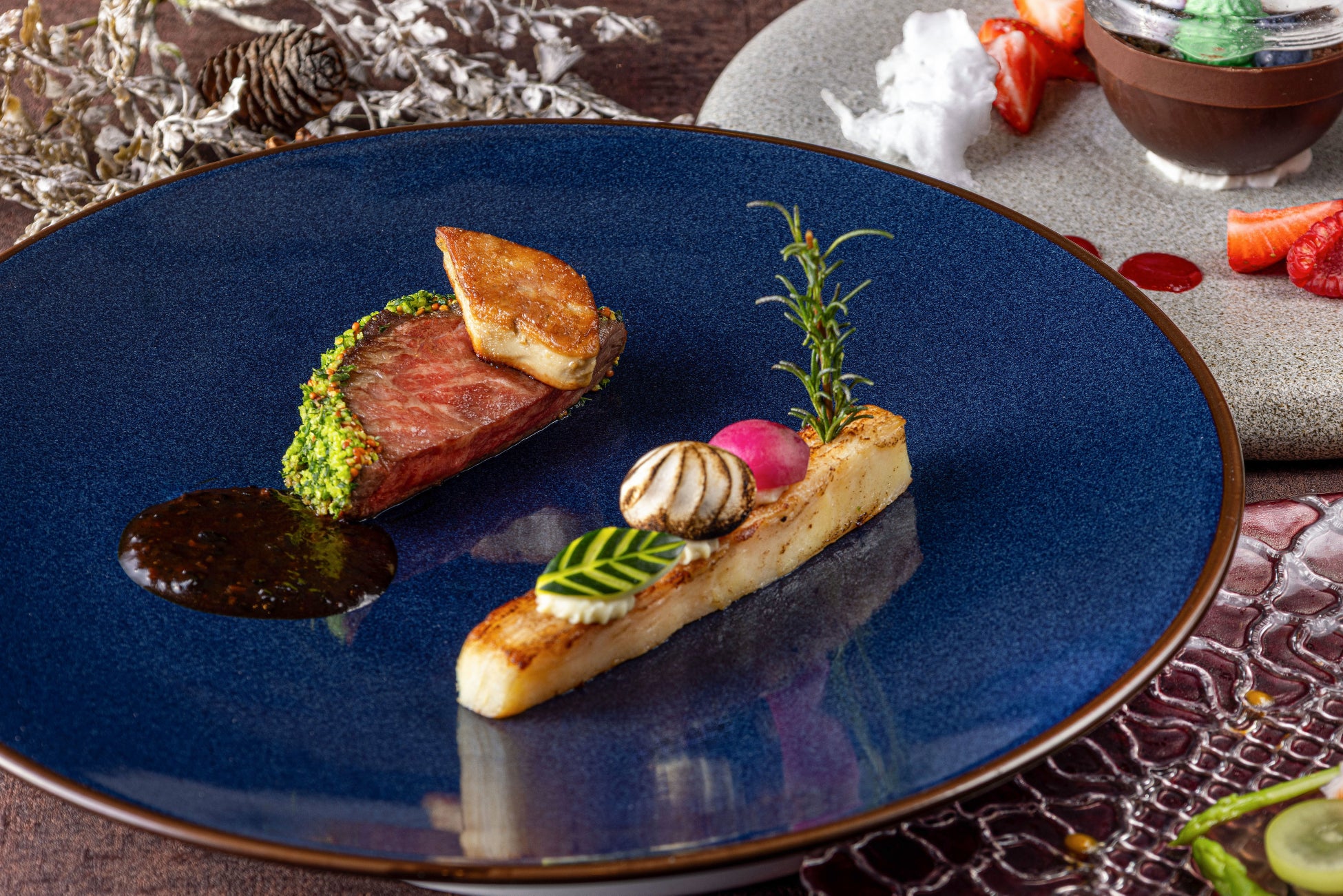 アミューズからデザートまで、シェフが一皿一皿にアートを描くように仕立てた、華やかなフレンチコースをご用意いたしま す。オードブルには、海の恵みを贅沢に味わう繊細な前菜を。メインディッシュには、サクサクのパイとふっくらとした真鯛 が奏でる、香り高い一皿と、和牛とフォアグラの濃厚で贅沢な味わいを楽しめる肉料理をご堪能いただけます。 シェフの感性が光る美しい盛り付けとともに、味覚と視覚で楽しむクリスマスの特別な一夜をご提案いたします。