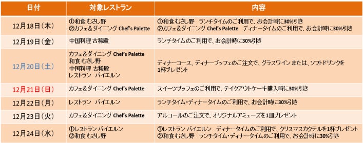 12 月 18 日(木)~24 日(水)までの7日間、対象レストランにおいて、対象メニューをご注文いただいたお客さまには、クリスマス カクテルのプレゼントなど、日替わりで嬉しい特典をご用意する「Advent Week at Sunshine City Prince Hotel」を開催いたします。