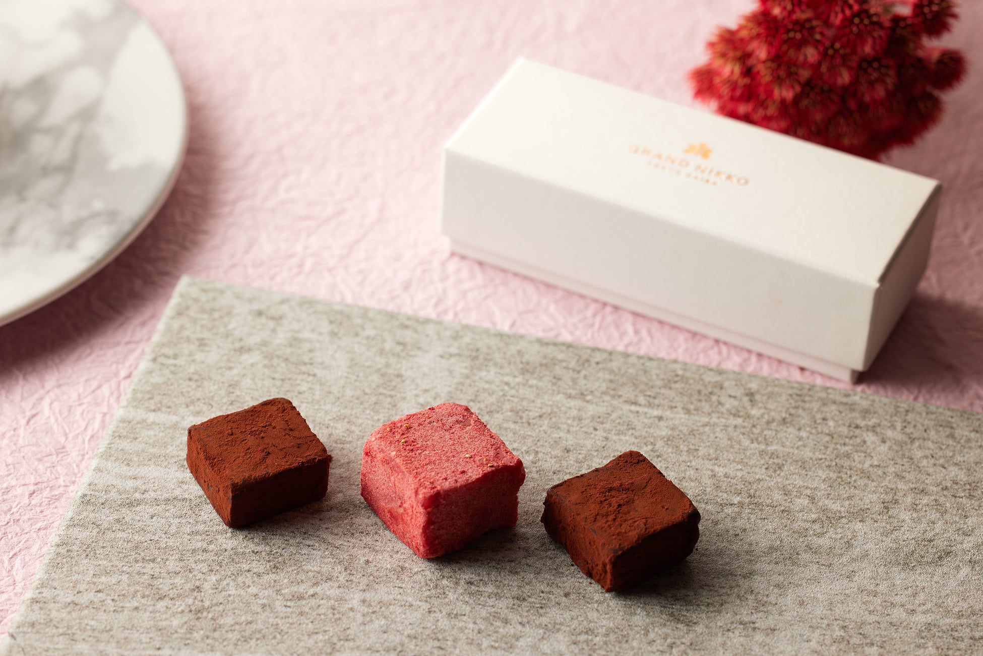香り高いカカオを感じられるビターチョコレートの生チョコと、華やかなピンク色とフルーティーな風味が特徴のルビーチョコレートを使用した生チョコの2種の異なる味わいがお楽しみいただけます。豊かなコクとなめらかな口どけ、カカオの余韻に浸れる贅沢なスイーツです。