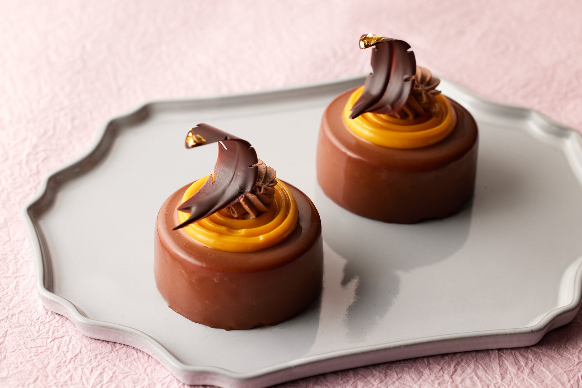 グランドニッコー東京 台場のバレンタインでは、2021年の初登場以降、毎年人気のルビーチョコレートとビターチョコレートをどちらもお楽しみいただける「ショコラクリュ」と、トップに施されたクレームマンゴーパッションの鮮やかなオレンジ色が目を引く「ムースショコラ キャラメルエキゾチック」が登場します。