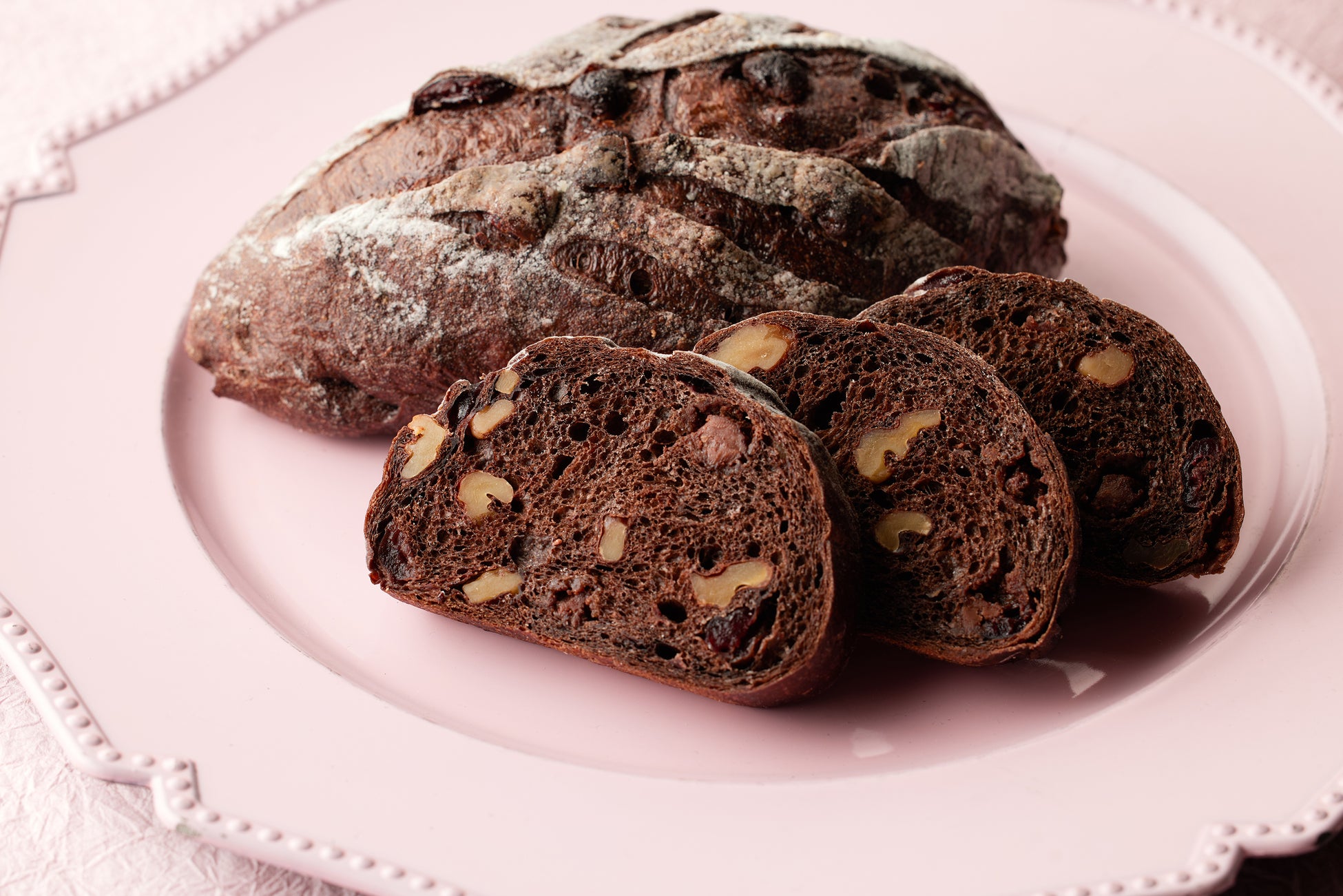 香りと食感にこだわったバケット生地に、ほろ苦い味わいのココアを練り込み、たっぷりのチョコチップと甘酸っぱいクランベリー、サクッと香ばしいクルミを混ぜ込んだバレンタインにぴったりなブレッドです。