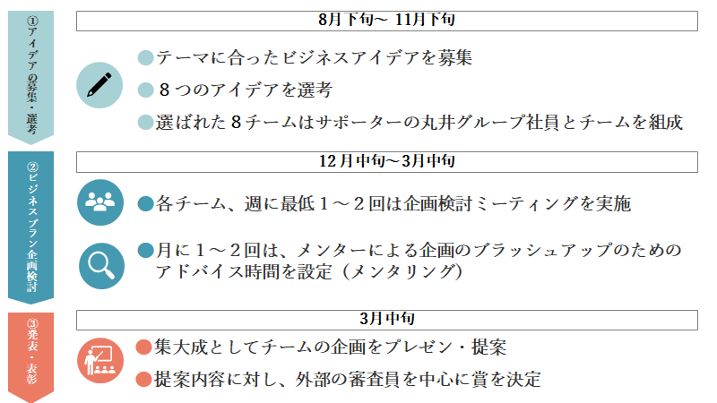 選考を通過したチームは、サポート役の丸井グループ社員とチームを組み、約3カ月間、新規事業のプランを企画します。