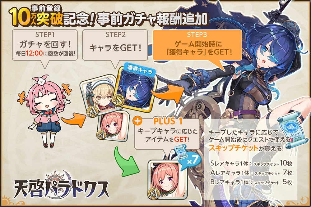 事前登録ガチャは毎日引くことができます。高レアリティのキャラクターを揃えてスキップチケットをゲットしてくださいね。