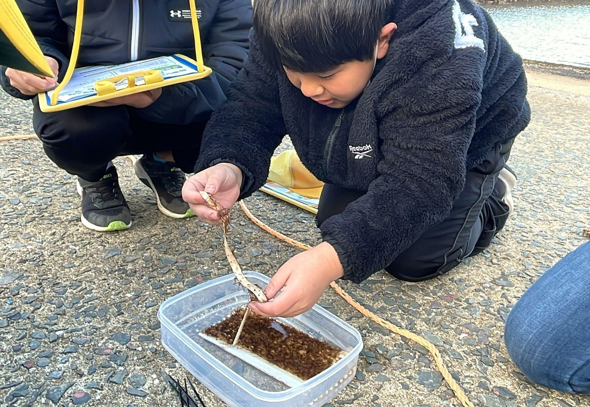 すべての海藻をロープに固定できたら、講師の中村氏が海藻を海に設置しました。この後は、海藻が海の栄養素でちゃんと成長できるのか見守ります。海藻の成長が気になり、設置場所に観察に行った子ども達もいたようです。