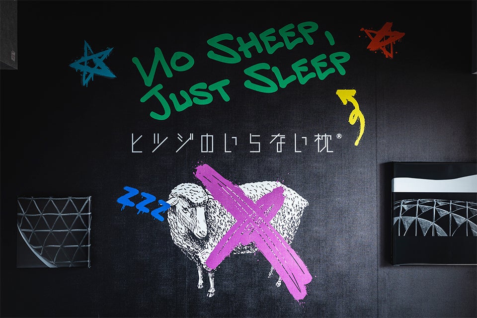 本プロジェクトでは、第一弾として2024年8月1日より「ヒツジのいらない枕」の3シリーズ(至極・新ハイブリッド3層構造・極柔)の中からお好きな製品をレンタルできるプランを開始いたしました。この度販売する第二弾は、枕に加えマットレス、掛け布団などの「ヒツジのいらない」シリーズ製品もご用意。更に、可愛らしい羊のイラストなどの客室装飾も施しました。室内は壁面と天井を黒で覆い、余計な光をシャットアウトすることで眠りに特化した空間を演出。壁面には「NO SHEEP,JUST SLEEP」というメッセージを掲出し、ヒツジを数えることなく、頭と身体を預けるだけで快適な睡眠へ誘うことを視覚的に訴求しています。睡眠の質が注目される昨今、眠らない街・すすきので、敢えて眠りと向き合うひとときを過ごしてみてはいかがでしょうか。