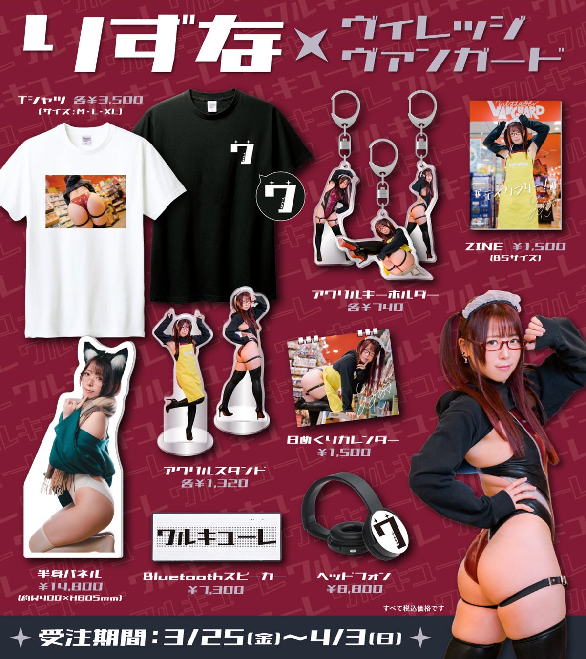 人気コスプレ配信者『りずな』が、ヴィレヴァン店内で仕事もせずにやりたい放題!定番のアクリルスタンドをはじめ、店内で暴れまわる『りずな』を収めたちょっとした写真集まで作っちゃいました!せっかくなのでファンクラブ『ワルキューレ』のデザインもグッズ化!今回は4月3日までの期間限定で、しかも受注販売なので気になるアイテムは迷わずゲット!