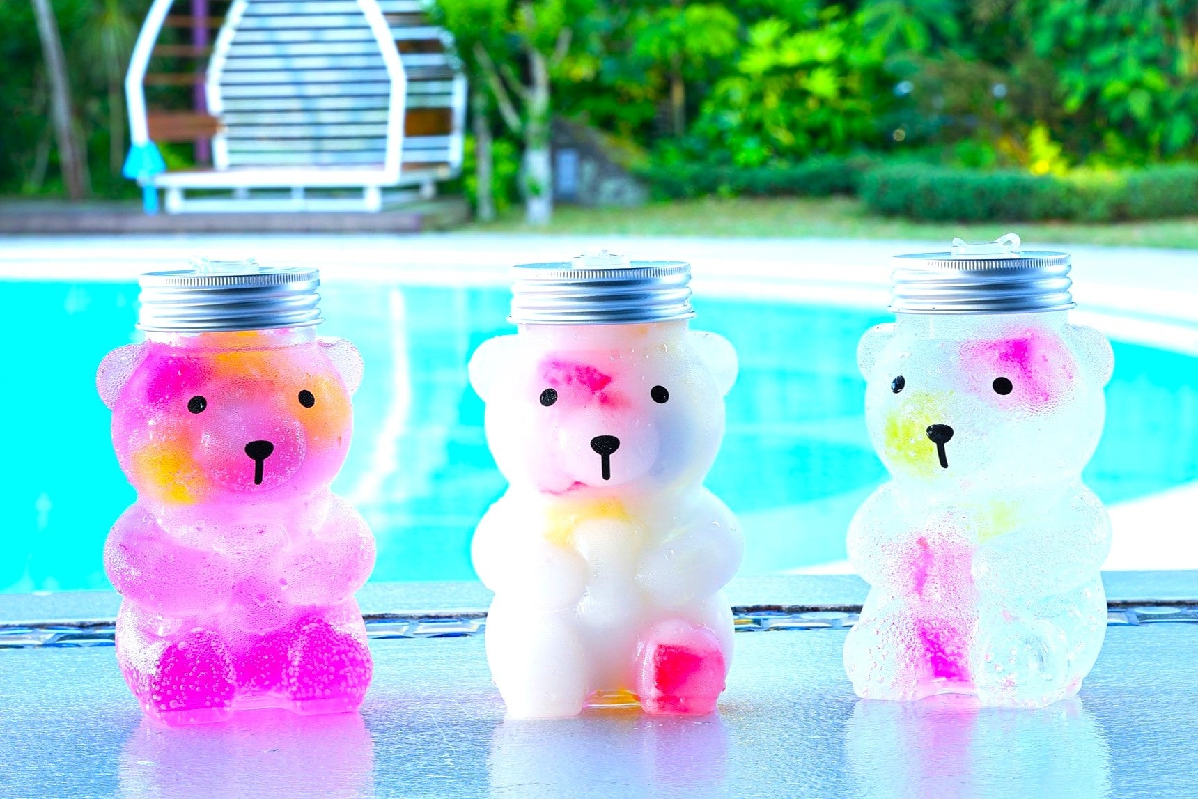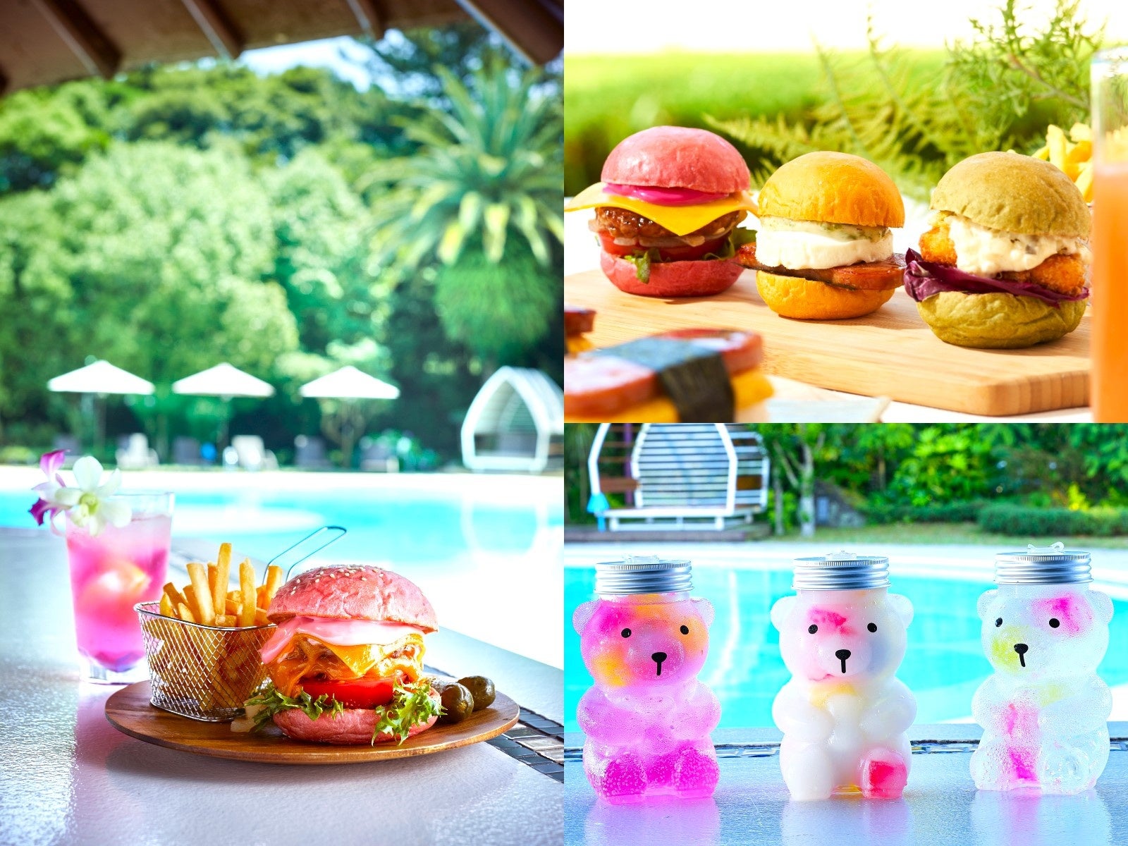 昨年、「Shell Pool」をご利用になったお客さまからご好評いただいた可愛いくまボトルドリンクが今年も登場!ボトルを片手に写真を撮るのも良し、夏の思い出として持ち帰るのも良し!な可愛さ満点のドリンク。カラフルなゼリーはもちっと食感がやみつきのサイダー味。ドリンクはピーチとグレープのサイダー「ももくま」、カルピスの「白くま」、サイダーの「クリスタルくま」の3種類をご用意しました。3つ並べても可愛いくまボトルはプールサイドで一息つくのにぴったり!