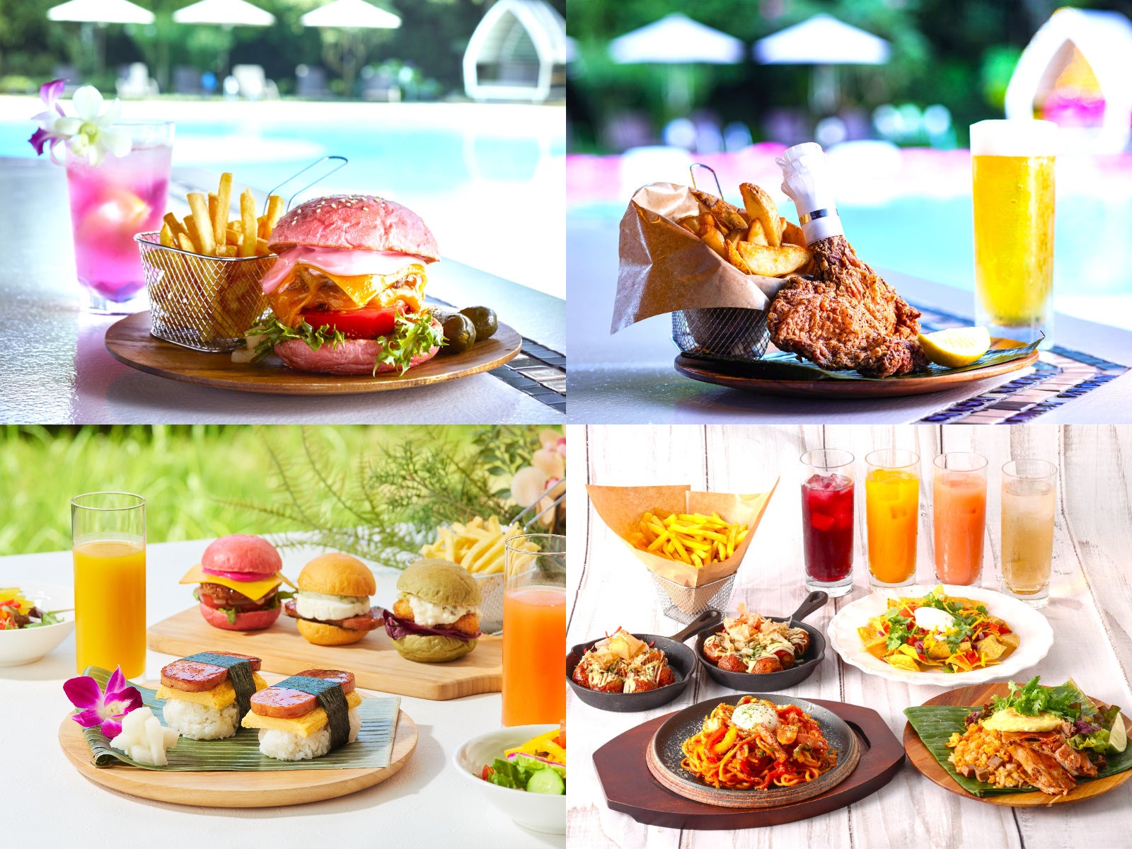 ご友人やご家族などとシェアして楽しみたい方に向けてお得なセットメニューをご用意しました。「“ピンク×ピンク”のスマッシュチーズバーガー」と「¥1,500以内のアルコールを含むドリンク」がセットになった「ピンクモーメントセット」(¥4,800→¥4,000)や、「骨付きフライドチキンとウェッジポテト」と生ビールがセットになった「フライドチキン&ビールセット」(¥3,700→¥3,300)、「3色スライダーバーガー」と「SPAMおにぎり テリヤキ風味」、「ミニサラダ2個」、「¥1,000以内のソフトドリンク」がセットになった2名さま向けの「シェル・ザ・ガーデンペアセット」(¥10,000→¥7,600)、「揚げたこ焼き」と「大盛りフライドポテト」、「特製スパイシーナチョス」、「鉄板ナポリタン」、「¥1,000以内のソフトドリンク4杯」がセットになった大人数向けの「ファミリーセット」(¥13,600→平日¥10,000、土・日・祝日、8/12~15¥11,000)の合計4種類をご用意いたしました。