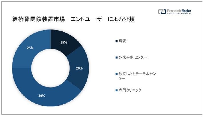 さらに、ヨーロッパの経橈骨閉鎖装置市場は、2035 年末までに約 35% の割合で第 2 位になると予想されています。市場は、病院、専門クリニック、独立したカテーテル治療センターなどの主要な最終用途部門の発展から恩恵を受けています。WHO によると、心血管疾患はヨーロッパの全死亡者の半分以上の原因であり、早期心疾患と脳卒中の 80% は回避することができます。 さらに、より多くの人々が心血管の健康を改善する方法を認識するようになるにつれて、経橈骨閉鎖装置の需要が大幅に増加しています。