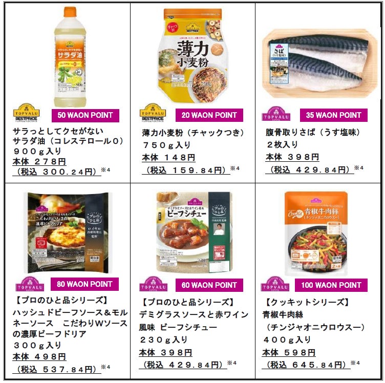 一例として、サラダ油や小麦粉といった生活必需品のほか、有名料理店のシェフ監修「トップバリュ プロのひと品シリーズ」やレンジとフライパンで簡単調理ができる冷凍ミールキット「CooKit(クッキット)シリーズ」などに最大約20%分のWAON POINTをおつけします。