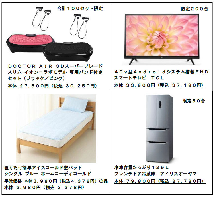 “イエナカでの生活”を充実させるアイテムを取り揃えます。一例として“乗るだけ、かんたんエクササイズ”の「DOCTOR AIR(ドクターエア)」とイオンのコラボモデルや“Androidシステム搭載”スマートテレビなどを、お買得価格で用意します。