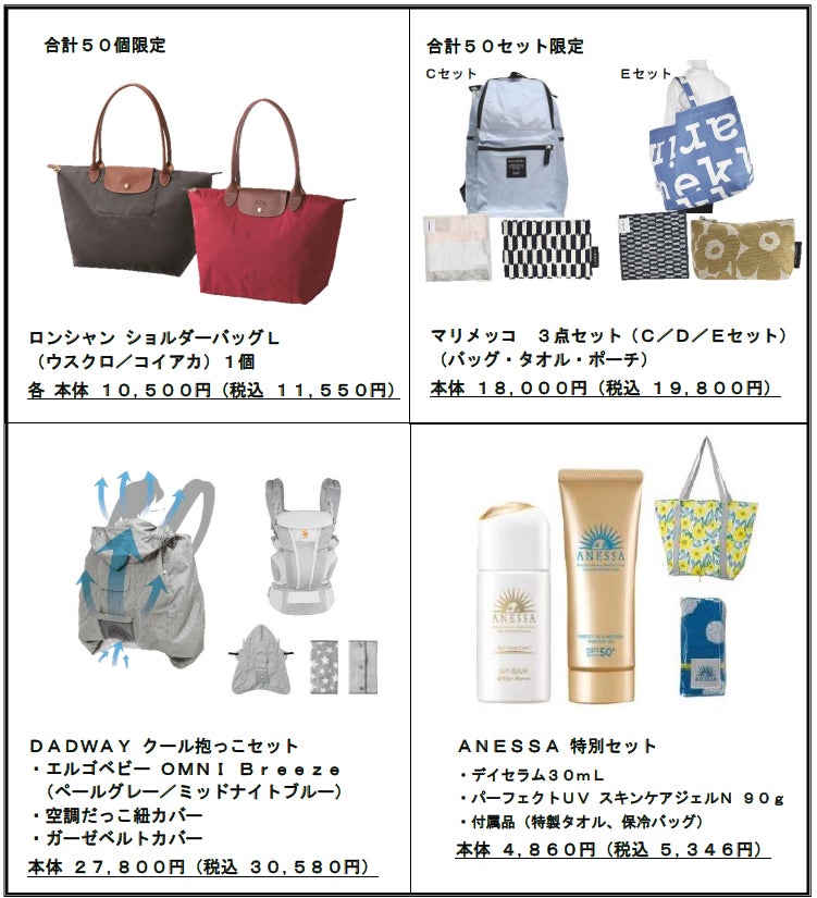 お出かけ機会の増加を見据えて、中身がたっぷり入り、折り畳み可能な「ロンシャンのショルダーバッグ」や「マリメッコ 3点セット」を用意するほか、空調ファン内蔵の抱っこ紐カバーで蒸れやすい背中とカバーの間に風を送り込み、効率的に汗を蒸発させ気化熱で身体をやさしく冷やす「抱っこ紐セット」、UV対策「ANESSA 特別セット」も販売します。