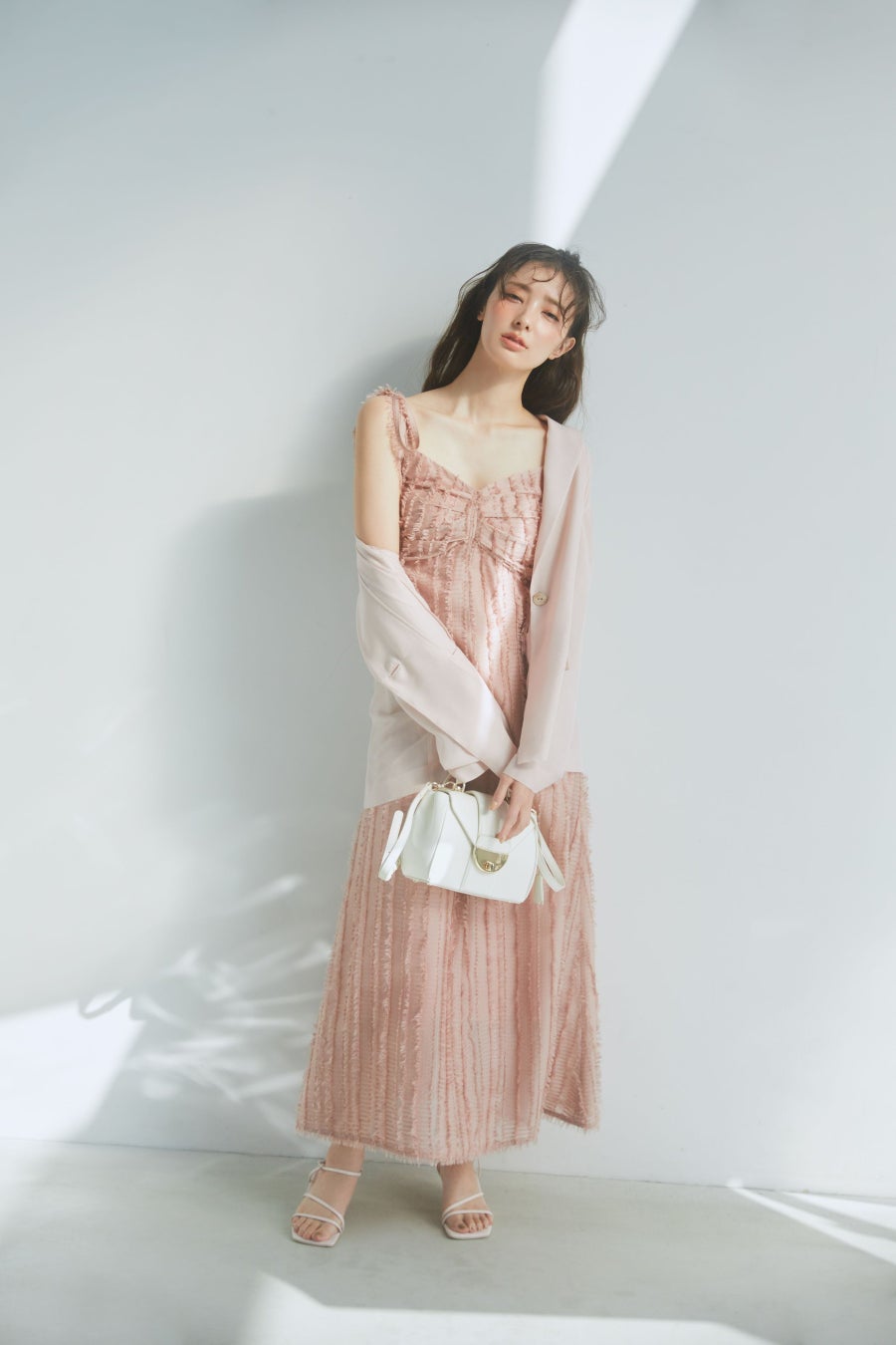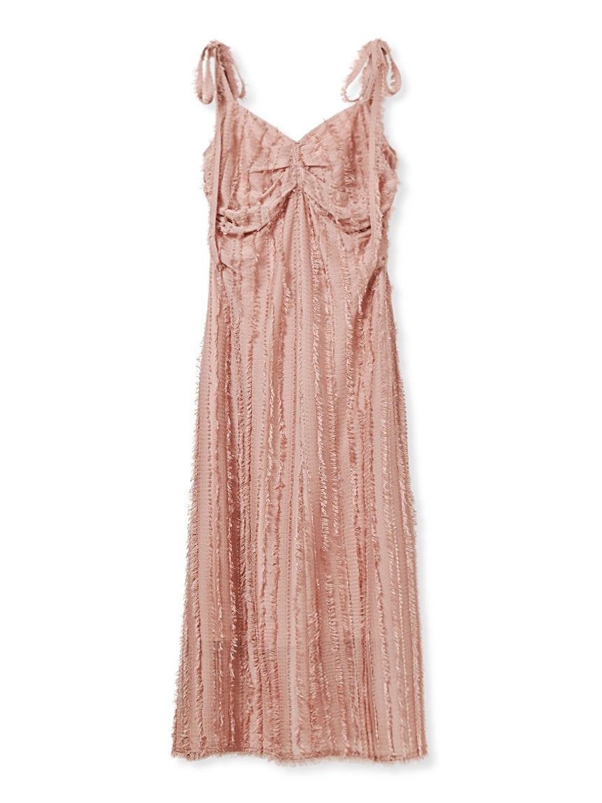 フリンジのフェザーシフォンジャガード生地が魅力的で、華やかな大人可愛いスタイリングが完成するキャミワンピース。肩のストラップはリボンデザインで調節が可能。バスト下の切り替えと縦のラインが脚長効果抜群でスタイルアップが叶います。大人フェミニンなピンクが池袋パルコ限定。