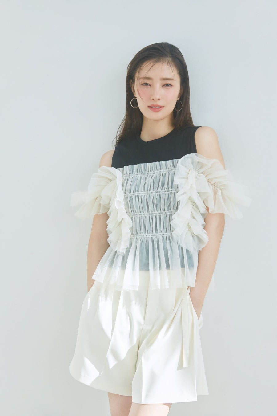 軽やかなチュールをドッキングしたカットソートップス。肩にかかるチュールパーツはシャーリングゴムのため、肩に乗せて顔周りを華やかに見せたり、肩から落としてオフショルダーで肌見せしたり2wayで楽しめるデザイン。バイカラーが目を惹くBLK×WHTが池袋パルコ限定。