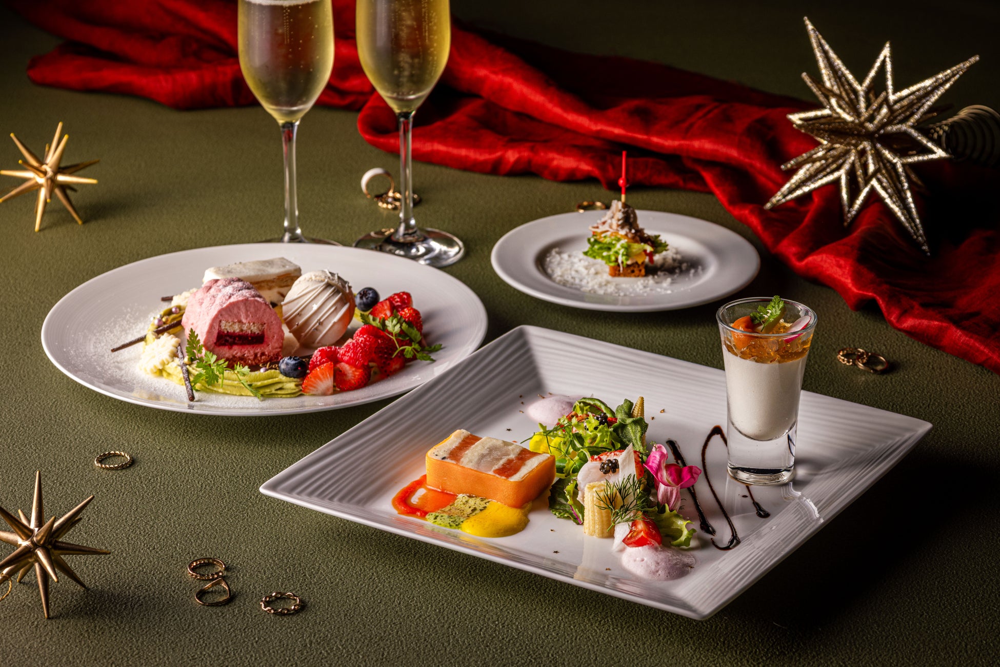 さらにアミューズ、美しい色合いの オードブル、リースに見立てたデザートプレートに乾杯シャンパン が付いたクリスマスディナーブッフェをお楽しみいただけます。