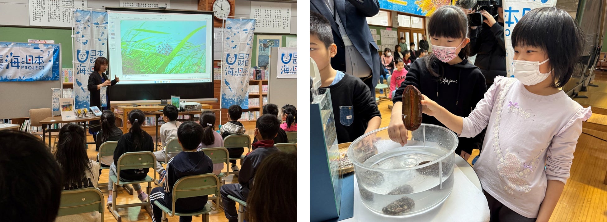 ①「海と日本プロジェクト」とは?「海ノ民話のまちプロジェクト」とは? ②『ムイとアワビの合戦』上映 ③学習会ワークショップ アニメーションの舞台となった津軽海峡に面する戸井沖の海は、北からの冷たい親潮と、南からの暖かい対馬暖流が共に入り込み、海の生き物の多様性や海環境の変化を知る絶好のフィールドです。この海域の水中映像を見ながら自分たちの住むまちの海への理解を深め、民話が伝えたかったこと、そして自分たちの海をどうしていきたいか考えてもらう機会としました。 ■上映会 ・海と日本プロジェクト「海ノ民話のまちプロジェクト」概要説明 海と日本プロジェクト北海道事務局より ・参加児童の質疑 ■ワークショップ ・アニメの舞台となった戸井の海を科学的に見てみよう ・函館の海の中を散歩してみよう ・ムイとアワビに触れてみよう |