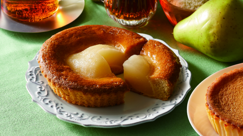 アーモンドプードルを使用した風味豊かな生地に、シロップ漬けのハーフサイズの洋梨をのせてしっとりと焼き上げました。さくらんぼの蒸留酒であるキルシュリキュールを入れたアプリコットゼリーで洋梨の風味が引き立つケーキです。