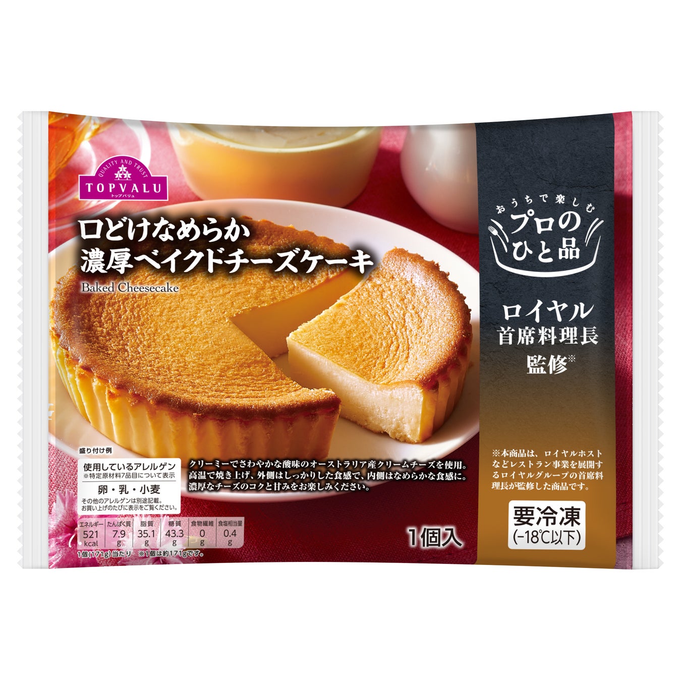 本商品は「トップバリュ プロのひと品」シリーズとして、ロイヤル首席料理長監修の下、素材とそのおいしさを最大限引き出す製法にこだわった本格スイーツです。一例として「口どけなめらか濃厚ベイクドチーズケーキ」は、クリーミーでさわやかな酸味が特長のオーストラリア産クリームチーズを使用し、高温で焼き上げることで外はしっかり、中は滑らかな食感で濃厚なチーズのコクと甘みがお楽しみいただけます。また冷凍のため、解凍するだけでいつでも手軽に食べられるほか、レンジで加熱することで焼き立てのような味わいも楽しめます。
