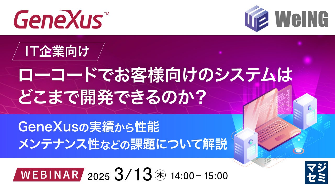 マジセミ株式会社は「【IT企業向け】ローコードでお客様向けのシステムはどこまで開発できるのか?」というテーマのウェビナーを開催します。